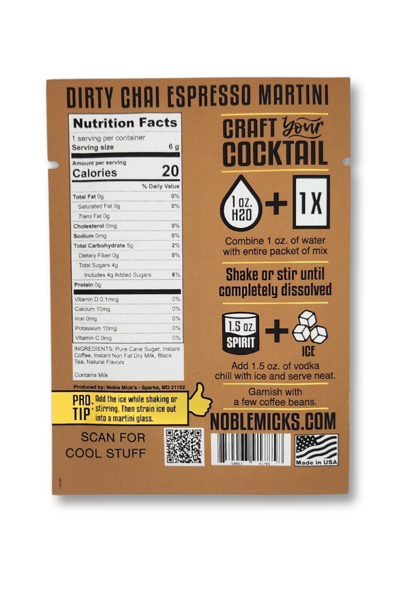 Noble Mick's single serve craft cocktails are the perfect way to enjoy a craft cocktail anywhere, anytime. At home or on the go there is no need to have all the ingredients to make your favorite cocktail. Noble Mick's is NOT an infusion product these cocktails are ready to go when you are. Simply add H2O and Spirit, shake or stir with ice and enjoy. Never overly sweet or artificial tasting. Seriously...our cocktails are delicious! At Noble Mick's we use all natural fruit and vegetable powders, natural spices and flavors and pure cane sugar. There is a real difference! *Contains milk