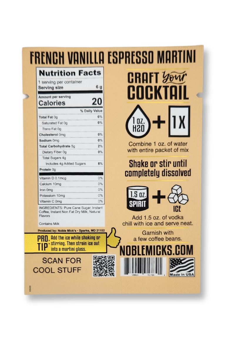 Noble Mick's single serve craft cocktails are the perfect way to enjoy a craft cocktail anywhere, anytime. At home or on the go there is no need to have all the ingredients to make your favorite cocktail. Noble Mick's is NOT an infusion product these cocktails are ready to go when you are. Simply add H2O and Spirit, shake or stir with ice and enjoy. Never overly sweet or artificial tasting. Seriously...our cocktails are delicious! At Noble Mick's we use all natural fruit and vegetable powders, natural spices and flavors and pure cane sugar. There is a real difference! *Contains Milk
